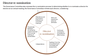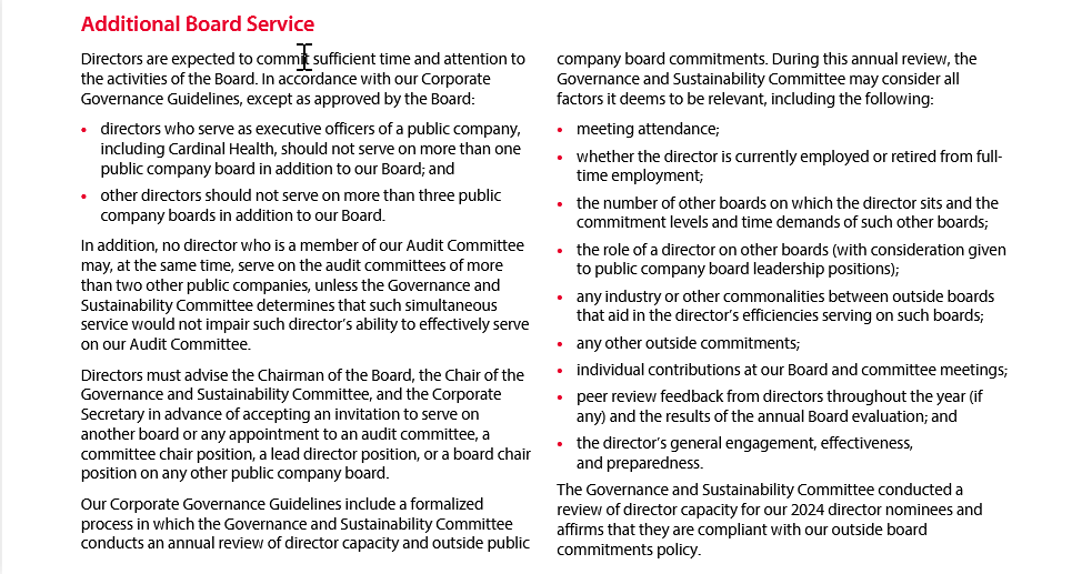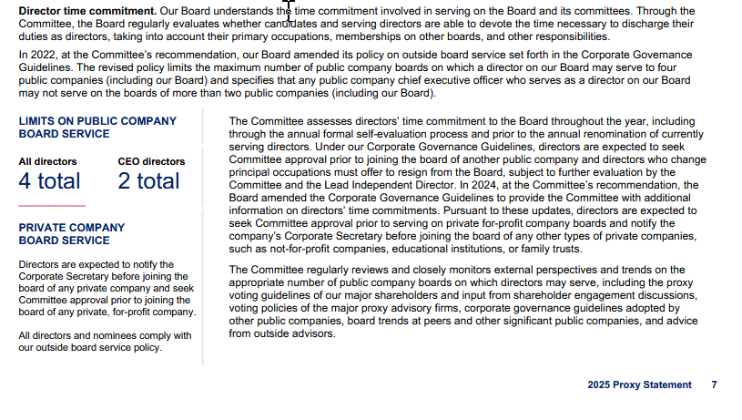 Most director policies limiting service on other boards reflect the stated guidelines of the company’s most influential investors and proxy advisors. Disclosure of company-specific board service policies is common to show alignment. While shareholders still show interest in these policies, there is increased interest in understanding the board’s analysis of each director’s ability to devote the time necessary for effective service rather than only a bright-line test. Accordingly, proxies are including more information about the board’s process for considering director time commitments.